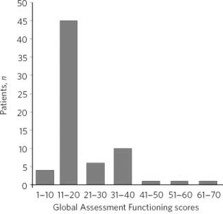 The Global Assessment Functioning Reference Endicott, Spitzer, Fleiss and Cohen11 scores are shown in Fig. 2, with the majority of individuals (66%) being scored between 11 and 20.