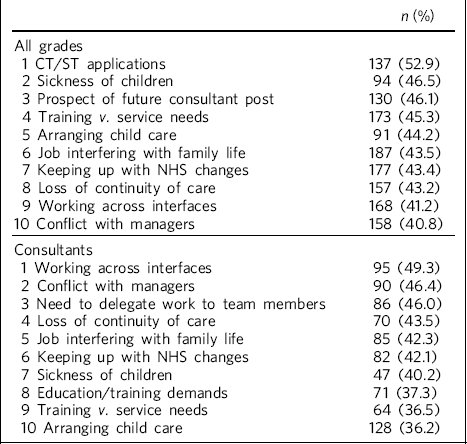 The top ten sources of high stress (percentage of moderate to extreme stress) differed for all grades and consultants, as illustrated inTable 2.