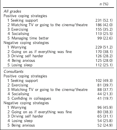 The most frequent positive and negative coping strategies (rated as used often and very often) for all grades and consultants are ranked inTable 3.