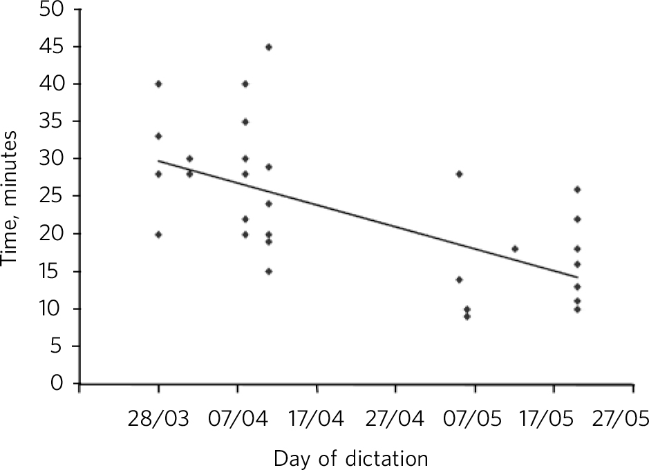 The average time taken by the specialist registrar to dictate and edit one letter using the voice recognition technology was found to decrease with increasing experience; however, this reduction did not seem significant on the scatter plot, possibly owing to the variable complexity and length of individual letters in psychiatry in comparison with previous studies that have shown such an improvement in efficiency with experience. Reference Bhan, Coblentz, Norman and Ali12 Again, such studies are about letters that follow a consistent set template. We were unable to compare the data between the registrar and the consultant for the reasons stated above, but the general consensus among the doctors was that the more experienced the doctor was at dictating using a conventional dictaphone, the easier it was to adapt to the voice recognition technology. Also, a standard template might be useful in minimising potential differences in the dictations produced by junior and senior doctors. We suggest that future studies consider this fact and any comparison among doctors at various levels of training would prove beneficial.