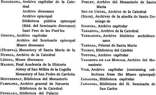 (Barcelona, El Escorial, Gerona, Huesca, Lérida, Madrid, Montserrat, Pamplona, Poblet, Seo de Urgel, Silos, Tarazona, Toledo, Tortosa, Vallbona de las Monjas, Vich)