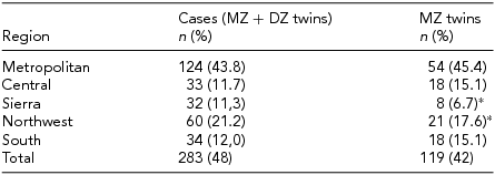 Among cases, the percentage of MZ twins was 42%, differing from the estimated one-third referred to in the literature (p = .04). The distribution of twin births as the percentage of MZ twins per region can be observed in Table 1. There was no statistically significant difference across regions regarding the percentage of twins (p = .744). However, the Sierra and Northwest regions showed a smaller percentage of MZ twins compared to the other regions (p = .0004), although with values closer to those described in the literature (30%).