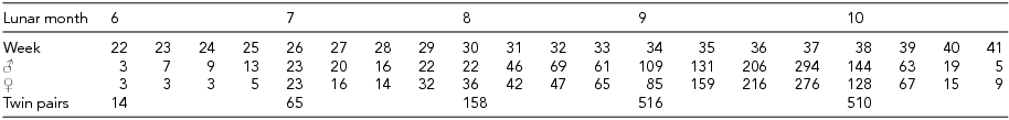 The calendar age of the neonates was determined on the basis of maternal information on the first day of the last menstrual period. The number of male and female neonates born in consecutive weeks of gestation and numbers of twin pairs from consecutive lunar months is presented in Table 1.