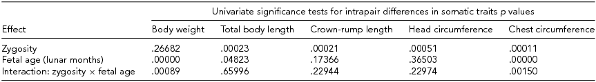 We conducted a univariate two-way analysis of variance (ANOVA) to study the effects of zygosity and fetal age on the magnitude of intrapair differences in the somatic traits of twins (Table 3). The p values for univariate tests suggested that zygosity exerted no significant effect on body weight, and fetal age did not modulate significantly either crown-rump length or circumference of the head. In contrast, both these factors exerted significant effects on total body length and circumference of the chest. In the case of the latter parameter, however, their effects were non-additive, that is, did not sum, and were additionally modulated due to interaction between the analyzed factors.