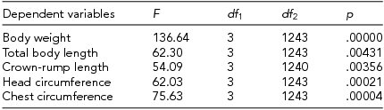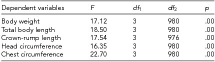 3. one-dimension and two-factor analysis of ANOVA variance for somatic traits in twins, standardized by gender and gestational age in order to reveal the diversity of the dependent variables, distinguished between the chosen categories of twins;