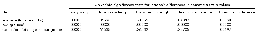 To determine the effects of intrauterine environment and fetal age in lunar months on the magnitude of intrapair differences, we conducted a univariate two-way ANOVA. The analysis showed that both the abovementioned factors exerted significant effects on body weight and circumference of the chest. These non-additive effects were additionally modulated by an interaction between the two factors. The magnitude of intrapair differences in the remaining traits was modulated solely by intrauterine environment (Table 7).