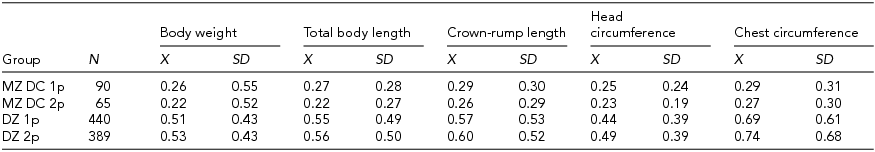 TABLE 4 Descriptive Statistics for Absolute Magnitude of Intrapair Differences in the Standardized Somatic Traits of Twins Stratified According to Their Zygosity and Chorionicity