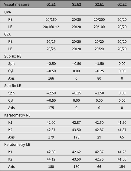 G1, genotype 1; G2, genotype 2; E1, city rearing; E2, country rearing; UC, Uncorrected (prior to subjective refraction); VA, visual acuity; RE, right eye; LE, left eye; UVA, uncorrected visual acuity; CVA, corrected visual acuity; Sub Rx, subjective refraction; Sph, sphere (refraction); Cyl, cylinder (refraction); K, keratometry.