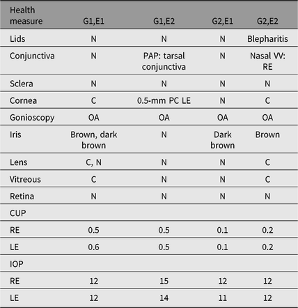 G1, genotype 1; G2, genotype 2; E1, city rearing; E2, country rearing; N, Normal; C, Clear; PC, Paracental; RE, right eye; LE, left eye; PAP, papillae; OA, open angle; VV, varicose vein; CUP, cup/disk ratio; IOP, intraocular pressure.