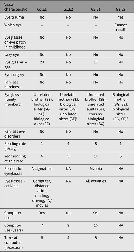 In one MZA pair, the city-raised twin read less than his country-raised brother but required eyeglasses, whereas the reverse was true for the other pair. The unrelated city-raised twins had been using a computer longer and more extensively than the one country-raised twin (G1,E2) who did. Based on their estimated date of first computer use, one city-raised twin (G1,E1) began wearing eyeglasses just 1 year afterwards, whereas his unrelated brother (G2,E1) began wearing eyeglasses 2 years prior. Findings from the twins’ visual life histories are summarised in Table 3.