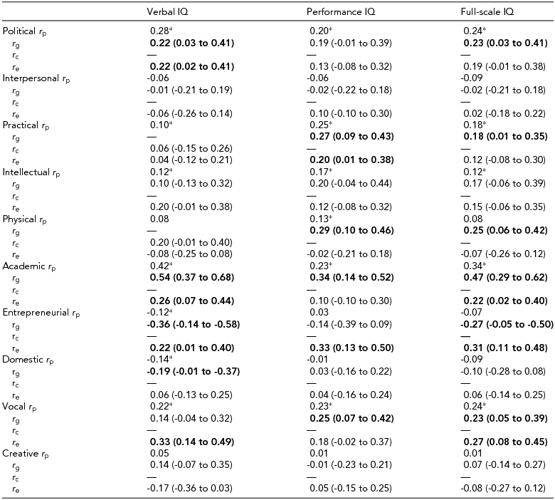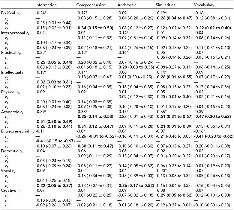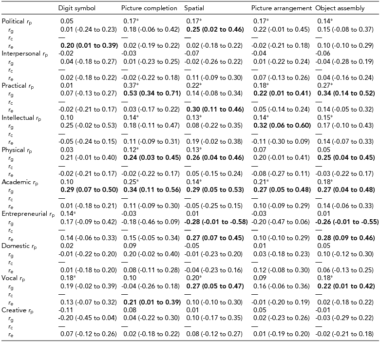 Tables 2, 3, and 4 list the phenotypic (observed) correlations between the 10 ability scores and the verbal intelligence subscales, the performance intelligence subscales, and the three intelligence composite scales, respectively. For the verbal subscales information and comprehension, positive relationships were found with the political, practical, intellectual, and academic ability scores. For the verbal subscale Arithmetic, positive correlations were found with the practical and academic ability scales and a negative correlation was found with the interpersonal ability scale. For the verbal subscale Similarities, positive correlations were found with the political, intellectual, academic, and vocal ability scales. For the verbal subscale Vocabulary, positive correlations were found with the political and academic ability factors and a negative correlation was found with the entrepreneurial scale.