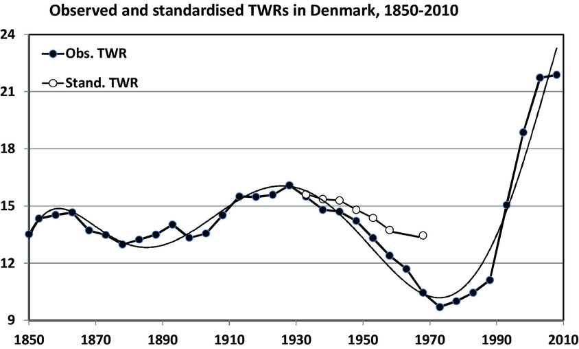 Figure 1 shows the observed TWR in Denmark for the period 1850–2012. One observes strong temporal fluctuations. Modeling these is difficult. The figure follows Fellman and Eriksson (Reference Fellman and Eriksson2014) in that it includes a trend line, but to obtain a good fit the line must be a sixth-degree polynomial. This temporal trend line yields a good fit (R 2 = 0.9321), but it cannot explain the fluctuations. For the period 1931–1967, a standardization was implemented. During the period 1931–1967 the rate decreases markedly. The standardization was performed to obtain a comparison with the situation in 1931–1935 as the norm. The standardization has reduced the decline, but a marked decrease remains. Note that the observed TWR for 1961–1967 is 11.69 per 1,000. After the standardization, the TWR for this period is 13.45. Consequently, the effect of the standardization is only 1.76. The standardization could reduce, but not eliminate, the deep trough. During the period 1931–1967 the difference between the standardized and observed TWRs shows an increasing trend. These findings support the statement given by Fellman and Eriksson (Reference Fellman and Eriksson2014) and observed above that standardization according to maternal age (and parity) cannot explain the fluctuations. Possible influential factors are explored in the Discussion section.