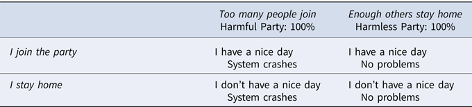 In Harmful Party, you might think: why not join too since disaster is already on its way and I might as well enjoy the party? Indeed, if you know that too many others are joining already (causing the health care system to crash), then the only difference between you joining too and you staying at home will be whether you have a nice day or not. Similarly, in Harmless Party, if you know that the threshold will never be met, again the only difference will be whether you have a nice day or not.