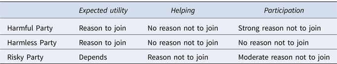 Which of these is worse? One option would be to give expressive and instrumental factors equal weight, and then (A) and (B) may be equally problematic. Another option would be to weigh them differently, and, again, there are various ways to do this. In this article, I can stay neutral about these possibilities. What matters, here, is that the expressive component (as identified in this articleFootnote 25) has at least some moral weight, and that joining Harmful Party is at least somewhat morally problematic – and indeed more so than joining the other parties.Footnote 26