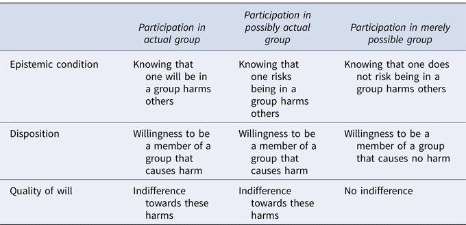 We do not assume that it is worse to participate in actual groups that cause harm than to participate in merely possible groups, or that it is worse to participate in possible groups that might still become actual than to participate in groups that might not … For, in all these cases, one participates in these various groups so long as one adds to the underlying dimension … This contribution is always actual, and this is what constitutes, we take it, the same participation-based reason to refrain from [joining] in all three scenarios. (Wieland and Van Oeveren Reference Wieland and Van Oeveren2020: 181)