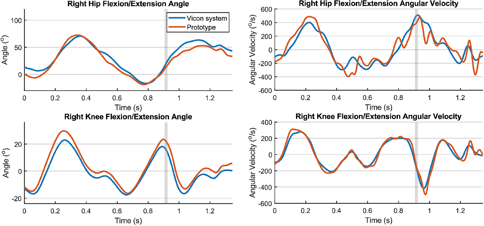 One participant performed six types of football-specific movements, and these were tracked with the IMU system and the optoelectronic measurement system at the same time. To compare the IMU data with the optoelectronic measurement results, the raw IMU data were converted to joint angles and joint angular velocities. An example of the comparison of the joint angles and angular velocities of the right leg during a kick and a jump measured with the prototype and the optoelectronic system, is shown in Figures 3 and 4, respectively.