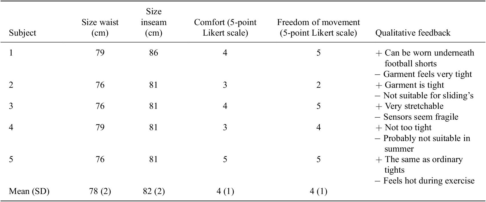 To investigate user experience, each participant filled in a short questionnaire. Table 2 summarizes the results. Testing the prototype in the field provided insight not only in user experiences, but also in reliability of the prototype and efficiency and effectiveness of the movement monitoring system. User experience scores on comfort and freedom of movement were relatively high. For both attributes a rating of 4 was given on average (Likert 5-point scale). A tight fit of the tights is required for minimizing motion artifacts of the sensors. Four subjects experienced the tightness of the garment as a positive aspect. One subject, with the largest clothing size, experienced the garment as too tight. In the future, multiple sizes and shorts need to be developed to enhance comfort and freedom of movement for every player. In general, the subjects did not feel restricted in their movements by the electronics in the tights. However, one subject noted that the garment would seem too fragile for sliding’s. In future versions, connections will be made more robust to enable the players to make sliding’s. Furthermore, the thickness of the sensor modules will be reduced, and the use of a cushioning layer can be explored.