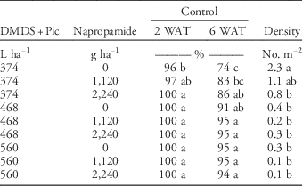 The combination of DMDS+Pic followed by S-metolachlor POST did not influence yellow nutsedge control; however, DMDS+Pic and napropamide rates did influence control. Yellow nutsedge control 2 WAT using DMDS+Pic at 374 L ha−1 without napropamide was 96%, while the addition of napropamide at 2,240 g ha−1 increased control to 100% (Table 1). Increasing the DMDS+Pic rate to 468 or 560 L ha−1 provided 100% yellow nutsedge control regardless of the napropamide rate. By 6 WAT, yellow nutsedge control when DMDS+Pic was applied at 374 L ha−1 with and without 2,240 g ha−1 napropamide was 86% and 74%, respectively. DMDS+Pic applied at 468 or 560 L ha−1 controlled yellow nutsedge 91% to 95% at 6 WAT, irrespective of napropamide rate. At 4 WAT, yellow nutsedge density was 2.3 plants m−2 when DMDS+Pic was applied at 374 L ha−1 without napropamide (Table 1). The addition of napropamide at 2,240 g ha−1 to DMDS+Pic at 374 L ha−1 reduced yellow nutsedge density to 0.8 m−2. When DMDS+Pic was applied at 468 L ha−1 or 560 L ha−1, 0.1 to 0.4 yellow nutsedge m−2 were observed, regardless of napropamide rate.