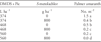 Table 4 Influence of dimethyl disulfide plus chloropicrin (DMDS+Pic) and S-metolachlor on Palmer amaranth density 4 weeks after bell pepper is transplanted.Footnote a , Footnote b