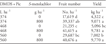 Table 5 Influence of dimethyl disulfide plus chloropicrin (DMDS+Pic) and S-metolachlor on bell pepper number and yield.Footnote a , Footnote b