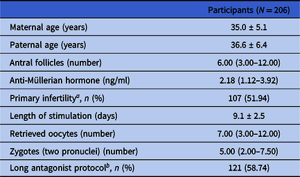 In total, 206 participants were enrolled for data analysis based on the inclusion and exclusion criteria. The demographic and cycle characteristics of all these study participants are shown in Table 1. In general, the average ages of the female and male participants were 35.0 ± 5.1 and 36.6 ± 6.4 years old, respectively. The median (Q1, Q3) number of antral follicles for the female participants was 6.00 (3.00, 12.00). The median (Q1, Q3) level of AMH for the female participants was 2.18 (1.12, 3.92) ng/ml. From these female participants, 107 participants (51.94%) were diagnosed with primary infertility, and 121 participants (58.74%) were treated using the long antagonist protocol for ovary stimulation. The average length of stimulation for the female participants was 9.1 ± 2.5 days. The median (Q1, Q3) number of the retrieved oocytes for the female participants was 7.00 (3.00, 12.00). The median (Q1, Q3) number of zygotes (two pronuclei) was 5.00 (2.00, 7.50).