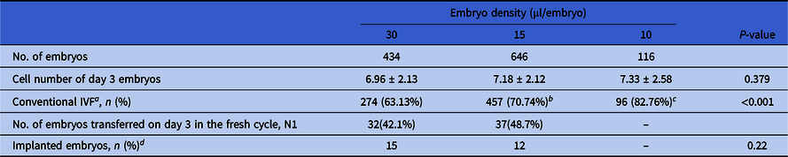 Table 2. Cycle and developmental characteristics of embryos among different embryo density groups (N = 1196)