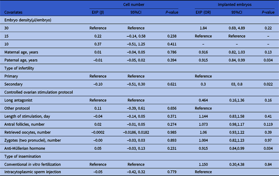 Impact of each variable on the cell number and clinical results of day embryos from univariate analysis based on GEE model
