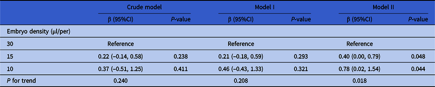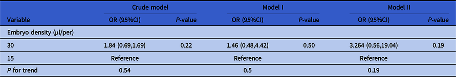 As shown in Table 5, the crude model was not adjusted for covariates and embryo density did not have significant effect on the clinical results (recorded as ‘whether the transferred embryo implanted successfully or not’, a binary variable) (group 30 µl/per embryo: P = 0.22, group 15 µl/per embryo: reference). Model I was adjusted for paternal age, AMH and type of infertility (significantly risk factors in univariate analysis), and embryo density still did not have a significant effect (group 30 µl/per embryo: P = 0.54, group 15 µl/per embryo: reference). Model II was adjusted for all the confounders and embryo density still did not have an effect on clinical results (group 30 µl/per embryo: P = 0.19, group 15 µl/per embryo: reference).