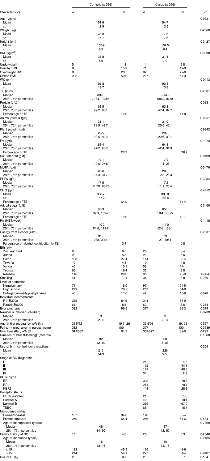A total of 792 black female participants (396 cases and 396 controls) could be matched from the original 874 enroled participants (415 cases and 459 controls). Unmatched case and control participants were due to missing dietary data, incorrect data captured, unmatched geographical areas and withdrawal of participants. Baseline characteristics were described for BC cases and healthy controls. Normally distributed variables were presented as means and standard deviations, whilst variables with a skew distribution were presented as median, upper and lower quartiles. Categorical variables were presented as frequencies and percentages. Mean differences in normally distributed data between cases and controls were estimated using Student’s t test for independent samples, while skewed variables were tested by the Mann–Whitney U test. Categorical variables were compared using Pearson’s χ 2 test.