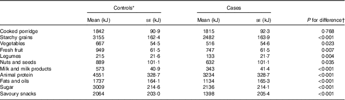 Differences in mean energy (kJ) intake (adjusted for confounders mentioned above) between cases and controls in food groups are reported in Table 2. Significant differences between cases and controls were observed in all food groups except cooked porridge. The control group reported higher energy intakes in all food groups except cooked porridge.