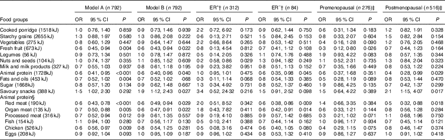 Conditional logistic regression was applied to estimate OR and 95 % CI to measure the risk of BC in relation to highest v. lowest energy (kJ) intake (determined by median intake) of food groups. Adjustments for possible confounding factors were made in a sequential model. Unadjusted estimates between matched case and control participants were reported in model A, whilst model B adjusted for the same confounding factors used in the generalised linear model. Analyses were also stratified according to menopausal status, oestrogen receptor-positive (ER+) and oestrogen receptor-negative (ER–) tumour types.