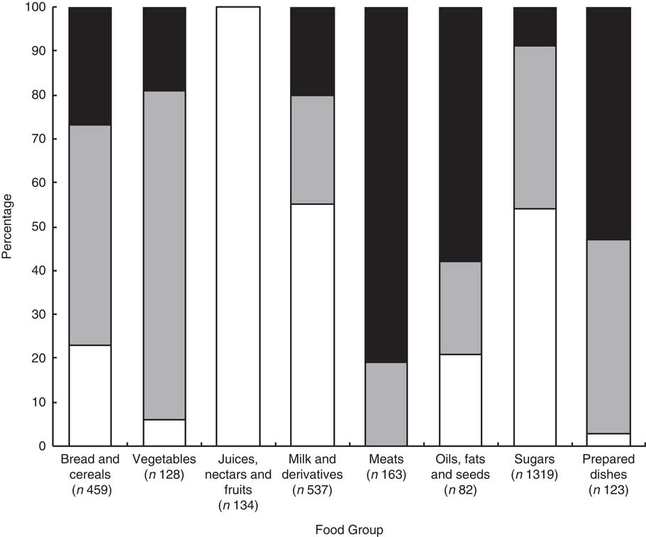 We found that 21 % of the processed foods were classified as high Na according to the Traffic Light Labelling criteria( 20 ). Noteworthy groups were Meats; Oils, fats and seeds; and Sauces, ready-to-consume seasonings, broths, soups and prepared dishes, as more than half of the foods were classified as high Na. It was observed that only two subgroups (cold cuts and hamburger) did not have foods classified as low Na. Since 95 % of the subgroups have foods classified as low Na, this indicates that the public generally has the option of choosing low-Na foods from a particular subgroup. In addition, this situation suggests the potential to reduce Na content in most of the processed foods assessed, especially those classified as high Na, which is also mentioned by Webster et al.( Reference Webster, Dunford and Neal 47 ).