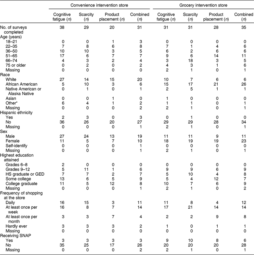Table 2 Customer demographics by store type and intervention type among a convenience sample of shoppers from one grocery and one convenience store in rural central North Carolina, USA, 2017