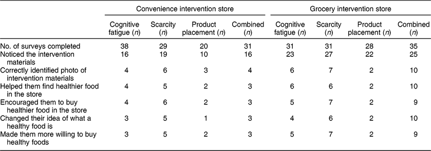 Table 3 Customer intercept survey results by store type and intervention type among a convenience sample of shoppers from one convenience store and one grocery store in rural North Carolina, USA, 2017