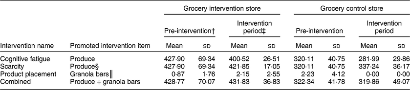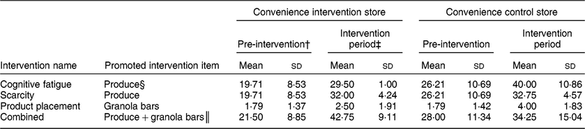 Research assistants conducted weekly fidelity checks in the convenience intervention store for each of the four interventions, which resulted in a total of sixteen fidelity checks. Overall, adherence to the intervention in the convenience store was high. The promoted intervention products were stocked for 100 % of all fidelity checks in the convenience store. Price tags were displayed for the promoted products for fifteen out of the sixteen fidelity checks (four out of four for the ‘cognitive fatigue’ fidelity checks; four out of four for the ‘scarcity’ fidelity checks; four out of four for the ‘product placement’ fidelity checks; three out of four for the combined intervention fidelity checks) and prices for all promoted items remained consistent during the 22-week intervention period. Promoted items appeared appealing (no bruising or damage to the products) in fifteen out of the sixteen fidelity checks (four out of four for the ‘cognitive fatigue’ fidelity checks; four out of four for the ‘scarcity’ fidelity checks; four out of four for the ‘product placement’ fidelity checks; three out of four for the combined intervention fidelity checks). Intervention materials were in place for sixteen out of the sixteen of fidelity checks (however, the floor arrow was ‘slightly creased and had several marks’ in two out of the four fidelity checks for the combined intervention).