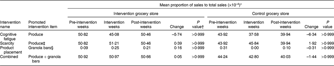 Table 7 Mean proportion of units sold of featured food items to total units sold from four different nutrition interventions in two grocery stores in rural North Carolina, USA, 2017