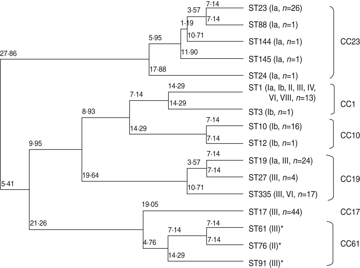 Five STs, including the frequently occurring ST23, which belongs to CC23 in serotype Ia, clearly differed from other CCs. ST10 and ST12, accounting for most of serotype Ib, belonged to CC10. ST1, belonging to CC1, was distributed in seven serotypes.