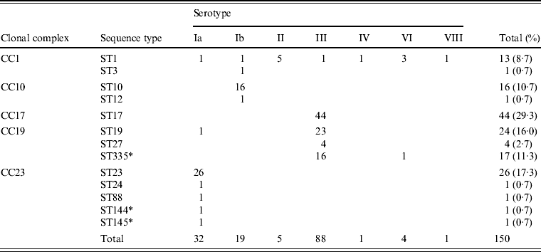 Table 2. Relationships between clonal complex, sequence type, and serotype in 150 invasive GBS isolates