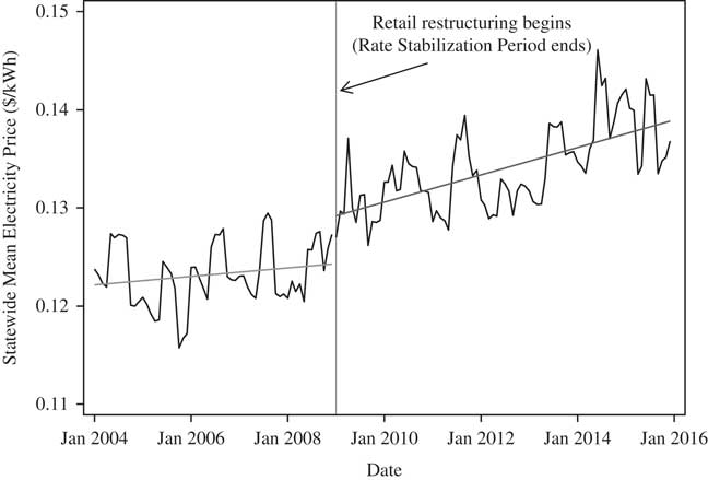 Price t provides our explanatory variable of interest, electricity price in a given month t. Month t is a month index beginning with our first available month of data, January 2004. The coefficient β 1 provides the general month-to-month price trend ignoring any intervention (i.e. the trend before retail restructuring). Post-restructuring is a dummy variable that provides the “interruption” of the series (i.e. our policy intervention point). Post-restructuring takes a value of “0” for months before restructuring, and a “1” for subsequent months during restructuring. The coefficient β 2 provides the change in the intercept of the electricity price trend after retail restructuring began. The coefficient β 3 of the interaction term (Month t ) (Post-restructuring) provides the change in the month-to-month price trend between the pre-restructuring period and the restructuring period. Thus, it provides the difference in the slopes of the two trend lines (post-policy minus pre-policy).