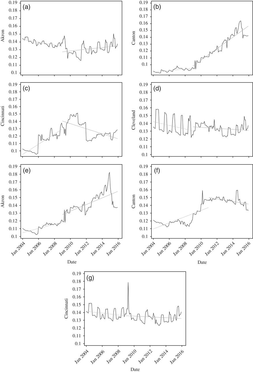 Figure 3 Interrupted time series plots. (a) Akron, (b) Canton, (c) Cincinnati, (d) Cleveland, (e) Columbus, (f) Dayton and (g) Toledo.