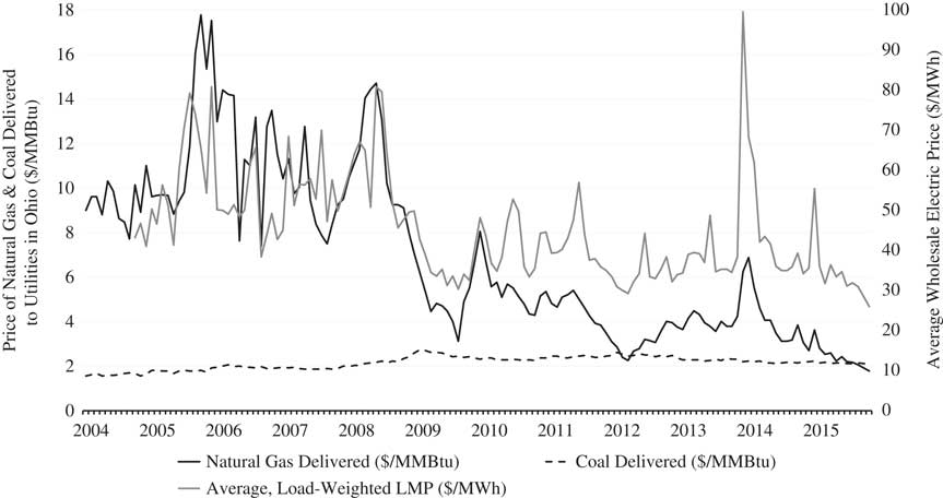Figure 4 Wholesale price of electricity, natural gas and coal in Ohio. Note: Values in inflation-corrected dollars per million metric British Thermal Units (BTUs) for gas and coal, and megawatt hours (MWh) for electricity. Wholesale prices reflect the average of each utility’s zonal load-weighted locational marginal price (LMP). Each utility’s load-weighted LMPs are calculated using hourly price and load data from PJM Interconnection, Midcontinent Independent Systems Operator and MarketViews. Natural gas and coal prices reflect the monthly final delivery price of each to electric generation in Ohio (inclusive of transportation costs). Source: EIA Electric Power Monthly (EPM), Table 4.10A. The spike in January 2014 reflects the Polar Vortex.