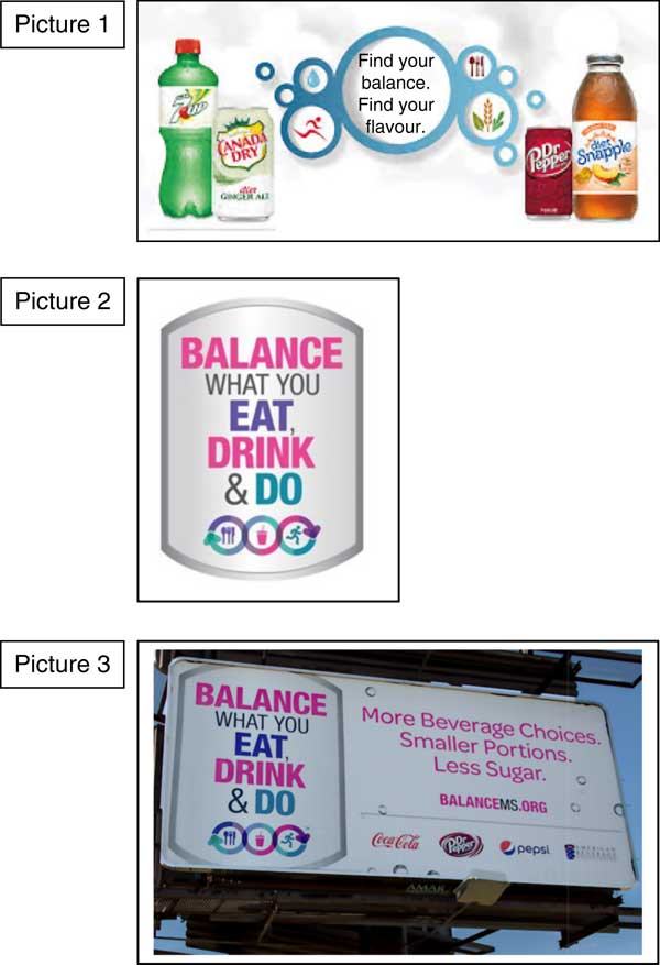 As of 2017, at least two BCI logos had been advanced, with messages stating: ‘Find your balance, find your flavor’ (Picture 1, Fig. 1; paired with pictures of regular and diet beverages such as soda and iced tea; see https://www.drpeppersnapplegroup.com/company/balance); ‘Balance What You Eat, Drink, and Do’ (Picture 2, Fig. 1; shown with pictograms of a set of utensils, a cup with a straw and a running figure; see http://www.cokeconsolidated.com/wellness); and ‘Balance What You Eat, Drink, and Do’, paired with the explanatory text, ‘More Beverage Choices, Smaller Portions, Less Sugar’, especially on billboards (Picture 3, Fig. 1). These pictures were sometimes shown with beverage company logos (e.g. Coca-Cola) and messages were presented in Spanish in some neighbourhoods.