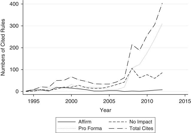 Figure 1 provides a summary of the frequency of EO 12898 citations in final published rules by the three substantive categories, as well as the totals: affirmative citation, order considered but no EJ impact found and the pro forma no relevance declaration. The figure provides information on the substantive distinctions among citations and the pattern of citations over time. There is significant variation in the use of citations, but affirmative citations tend to be the most infrequently utilised category. The figure shows that affirmative citations were rare in the immediate wake of EO 12898’s passage, but they slowly gathered steam, a development that should not be surprising given the ideological orientation of the Clinton Administration (1994–2000). The figure also reveals that cites as a whole increased between 1994 and 2000, showing increasing overall levels of attention to the issue of EJ, even if affirmative cites were a small percentage of the overall cites.
