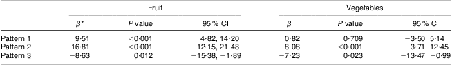 Table 6 Regression of pattern scores for patterns 1, 2 and 3 on fruit consumption (g/d) and vegetable consumption (g/d): children (n 642) aged 1·5–10 years, UK National Diet and Nutrition Survey Rolling Programme (2008–2010)