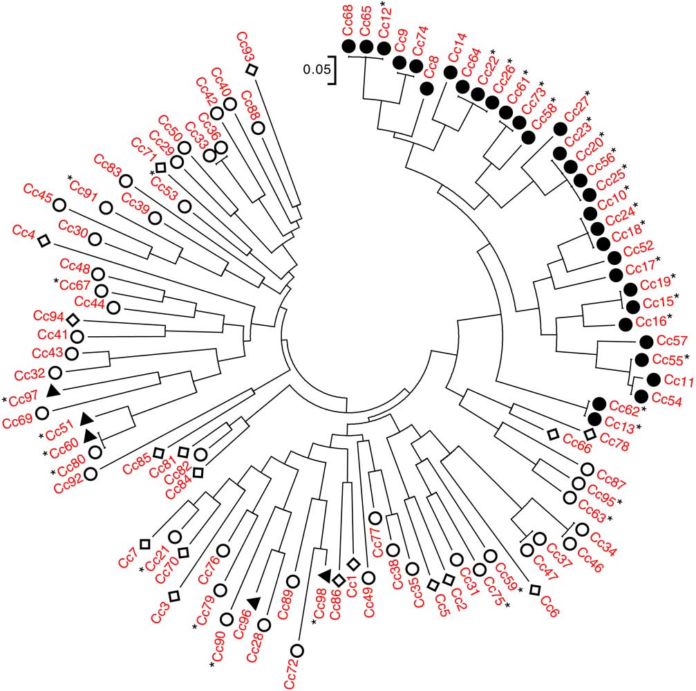 Figure 1 Genetic relationships among the 98 accessions of Conyza canadensis. Entries are characterized as glyphosate resistant (●), non–target site glyphosate resistant (▲), glyphosate susceptible (○), and unknown (◊). Those followed by a star (*) have sequence coverage of exon 2 of EPSPS2. Thus, confirmed target-site resistant entries (i.e., with the Pro-106-Ser substitution) are those preceded by ● and followed by *.