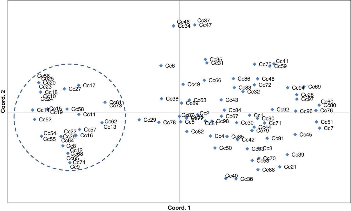 Figure 2 Principal coordinate analysis was constructed using simple sequence repeat Conyza canadensis data. The first two coordinate axes represent 18% and 9% of the observed genetic variation, respectively. Accessions within and outside the dashed line circle represent the population subgroups identified for the purpose of conducting an analysis of molecular variance (see Table 3).