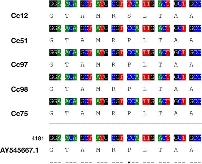 Figure 3 EPSPS2 (gb|AY545667.1|: 4181–4210) sequence of five representative Conyza canadensis accessions: a target-site resistant accession from Ontario (Cc12), non–target site resistant accessions from Ontario, Michigan, and Delaware (Cc51, Cc97, and Cc98, respectively), and a glyphosate-susceptible accession from Ontario (Cc75).