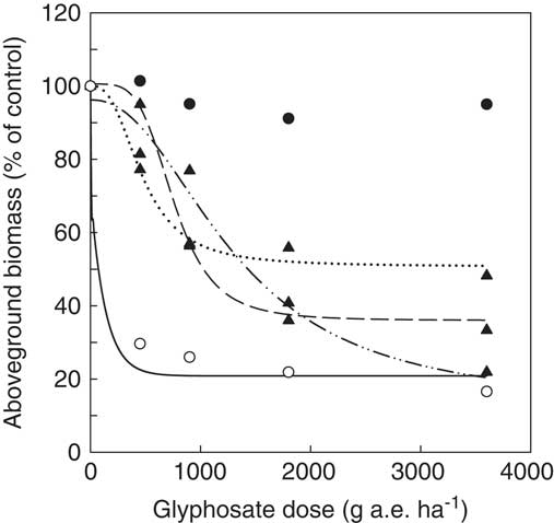 Figure 4 Dose response of five representative Conyza canadensis accessions: a target-site resistant accession from Ontario (Cc12, ●), non–target site resistant accessions from Ontario (Cc51, ▲,
