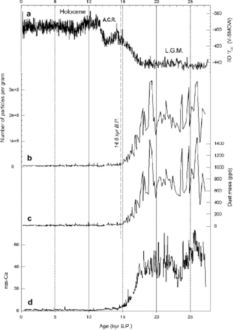 There are certain features of particular interest in the record, such as the plateau in dust concentration during the ACR phase, the development of a 200 year phase of very low concentrations reaching a minimum value around 11500 years ago, and a general decrease during the Holocene.