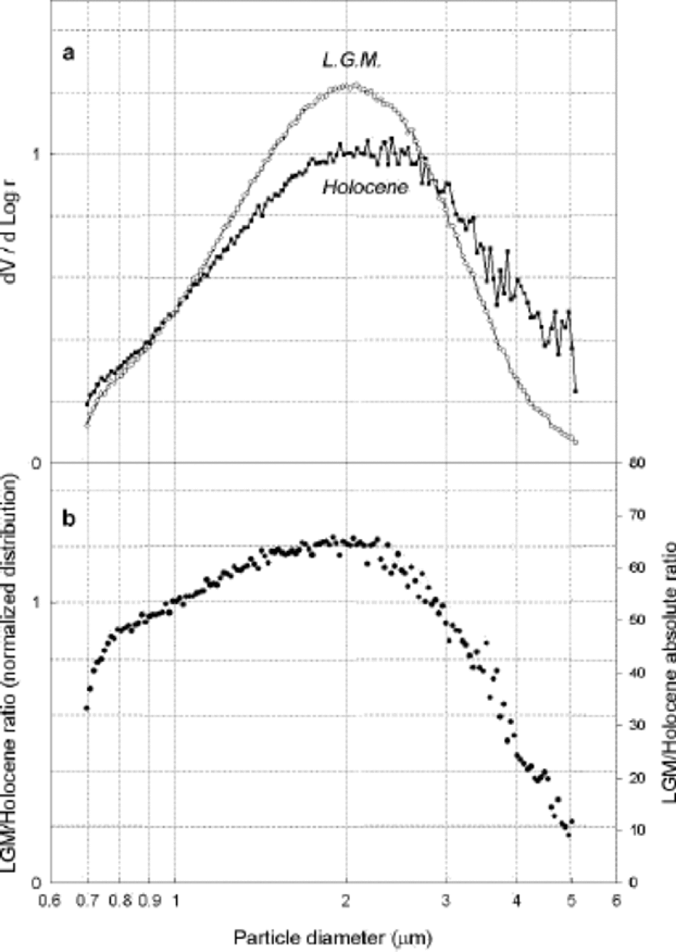 Figure 2b shows that the LGM/Holocene ratio varies with size, in particular being much smaller for large particles. Compared to the Holocene size distributions, LGM distributions display more small (1–3 μm) and fewer coarse (3–4 μm) particles. the ratio of particles with diameters of 2–5 μm decreases approximately as a function of the third power of the diameter (i.e. it is proportional to the mass), suggesting that depletion of large particles might be due to an apparent gravitational settling during transport. In addition, glacial samples display very similar modal diameters (mean Dv is 1.9±0.07 μm) and σg values (1.6±0.03). for Holocene samples, both parameters are higher and display a larger variability: mean Dv of 2.07±0.24 μm, and σg of 1.8±0.15.
